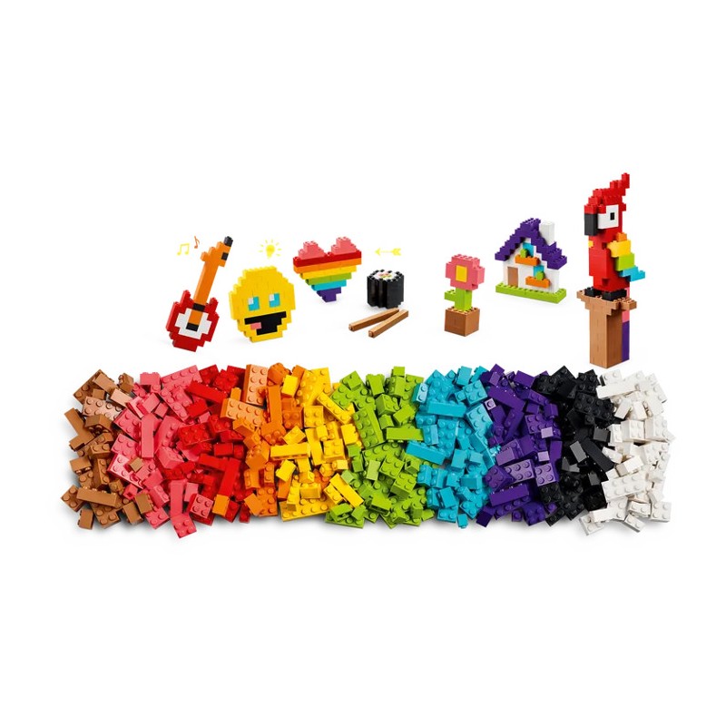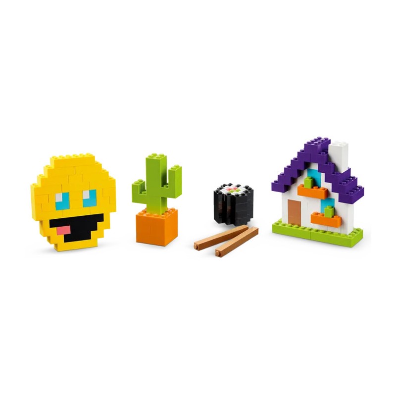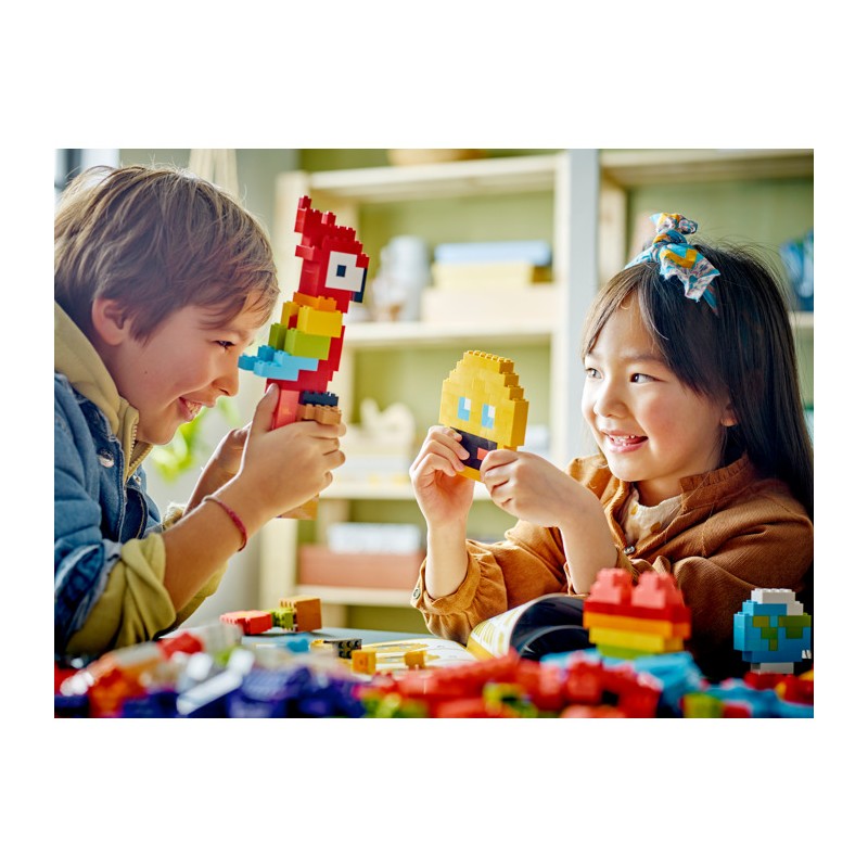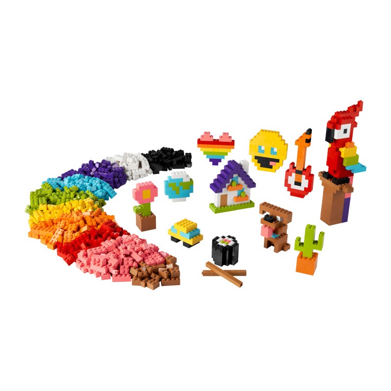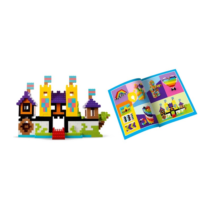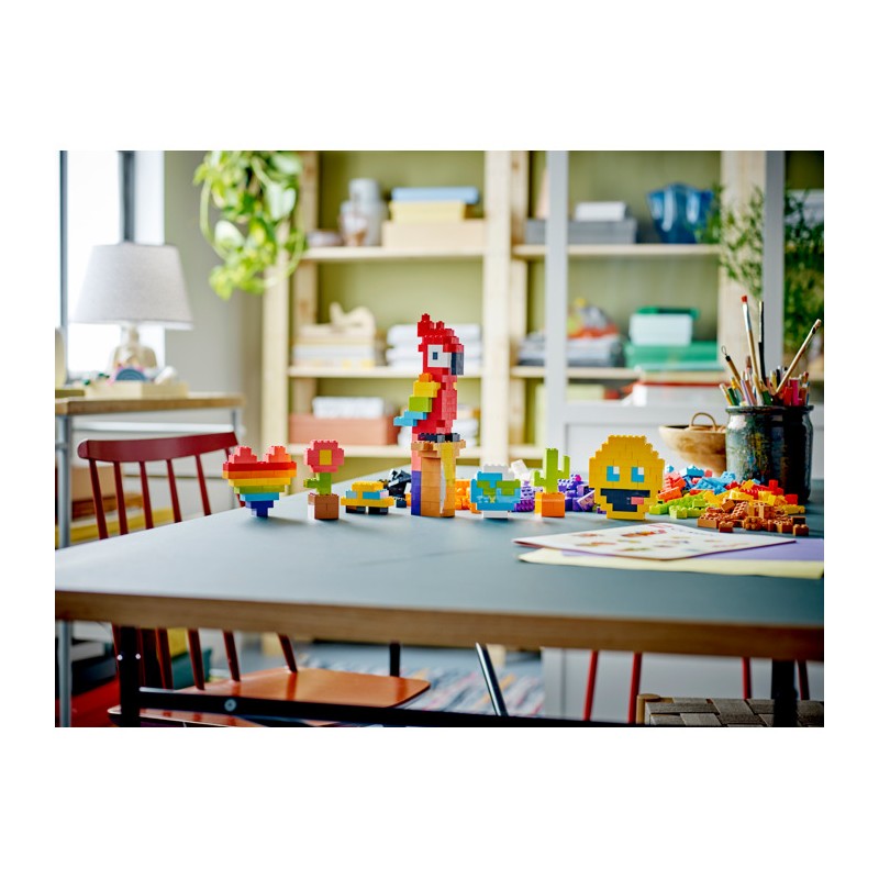 В наборе большое количество ярких кубиков LEGO, особенно оригинальный и очень популярный кубик 2x4! В набор входят четкие печатные инструкции по сборке забавных моделей игрушек, в том числе автомобиля, глобуса, цветка, сердца, гитары, дома, смайлика-смайлика, попугая, собаки и яблока. Этот набор предназначен для поощрения открытой творческой игры. Он даже включает в себя журнал с инструкциями по сборке и предложениями для вашего начинающего дизайнера. Цифровую версию инструкций по сборке набора также можно найти в приложении LEGO Builder.