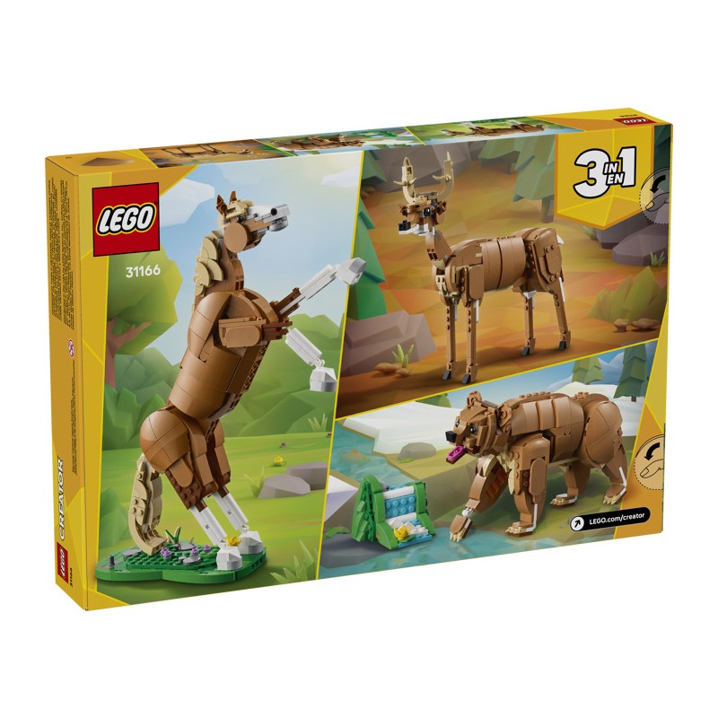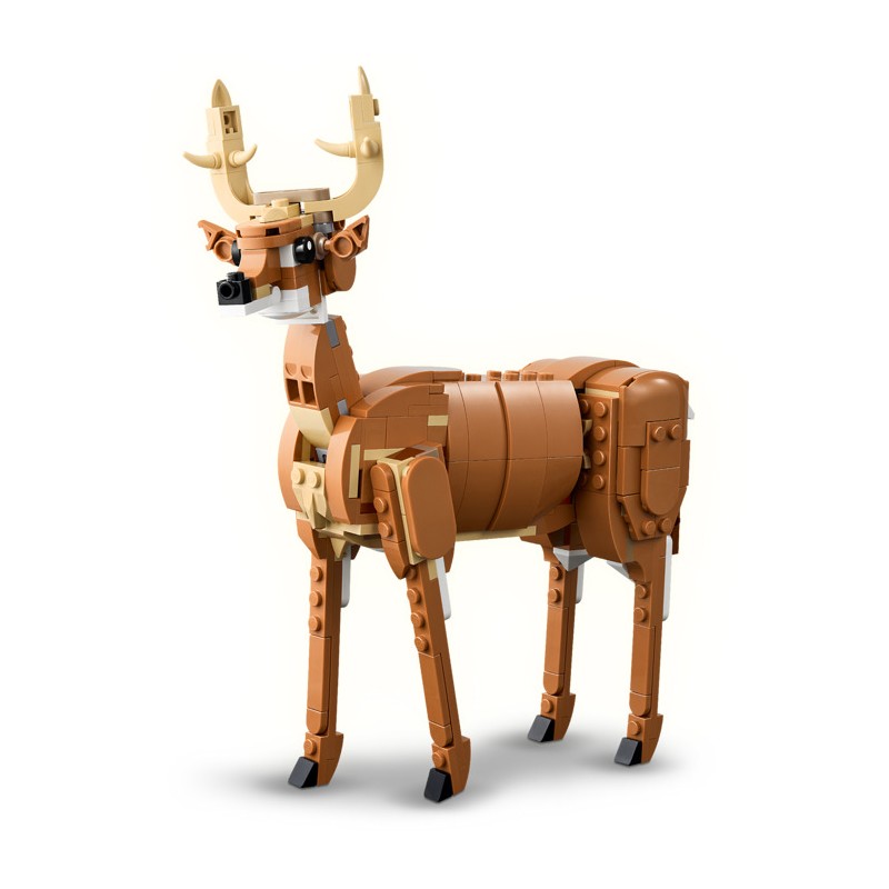 Из одного и того же набора кубиков дети могут собрать 3 разных варианта: подвижную лошадку LEGO®, подвижного медведя с небольшим водопадом или подвижного элегантного оленя. Все три фигурки животных из этого трансформирующегося набора станут креативными и весёлыми подарками для детей.