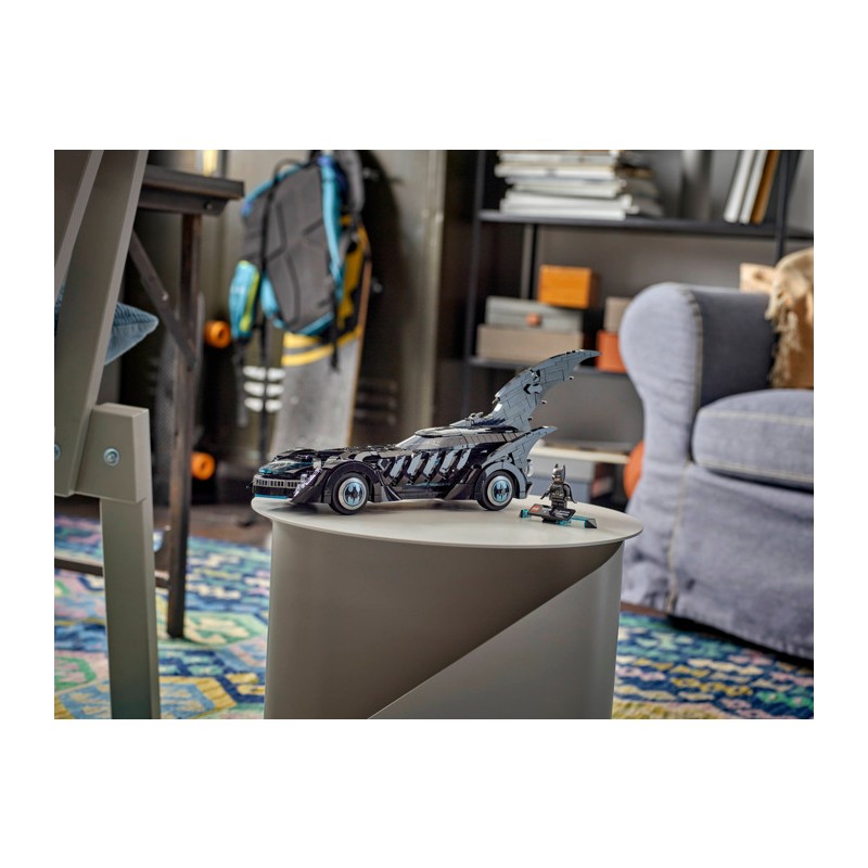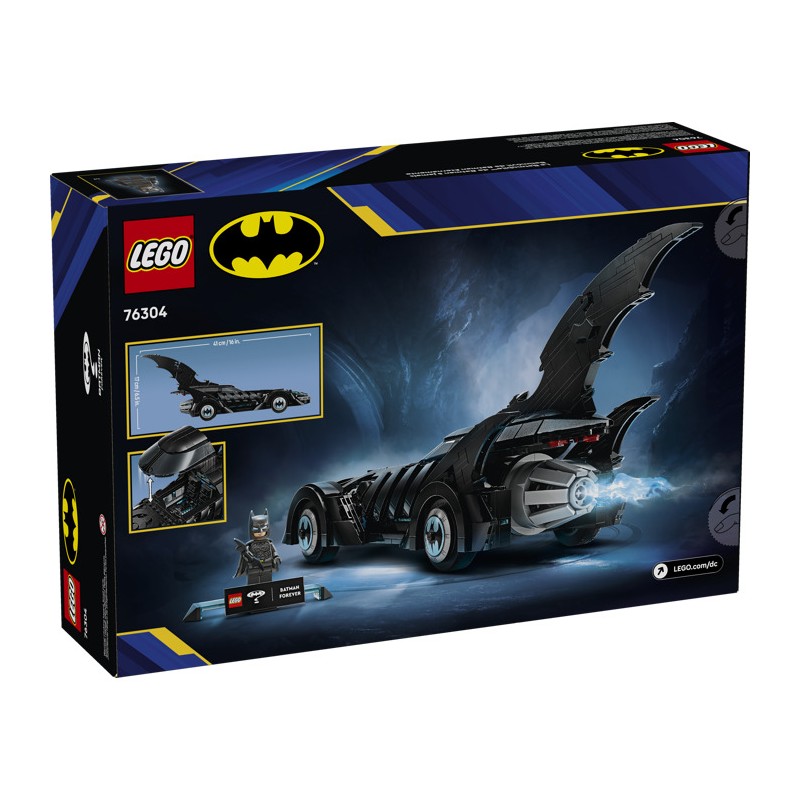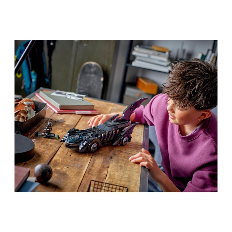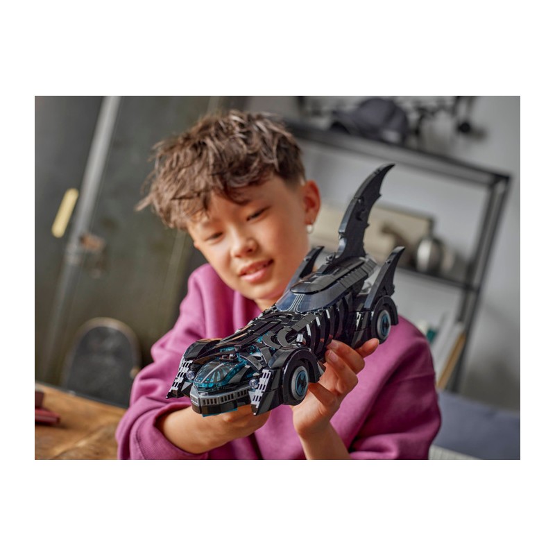 Эта аутентичная копия культового автомобиля из фильма «Бэтмен навсегда» оснащена литым лобовым стеклом, вращающимися колёсами, декоративными элементами и открывающейся кабиной, открывающей детально проработанный салон. В комплект также входит минифигурка Бэтмена со специальной подставкой. Для ещё большего удовольствия от цифровой сборки сборщики могут увеличивать масштаб, вращать модели в 3D и отслеживать ход сборки с помощью интуитивно понятного приложения LEGO Builder. Содержит 909 деталей.