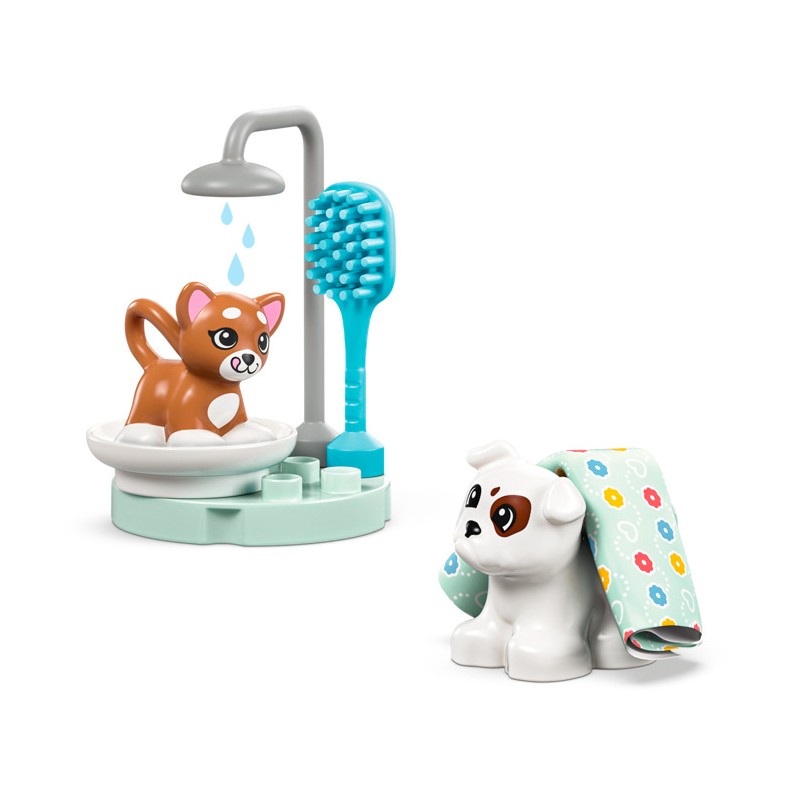 В этот набор для клиники входят 2 животных LEGO DUPLO — милая собака и игрушка-кошка — а также фигурка ветеринара. Дети приветствуют больных питомцев в клинике и притворяются ветеринарами, чья работа — вылечить их. Они взвешивают питомцев на весах, слушают их сердцебиение, затем тщательно моют и расчесывают их.