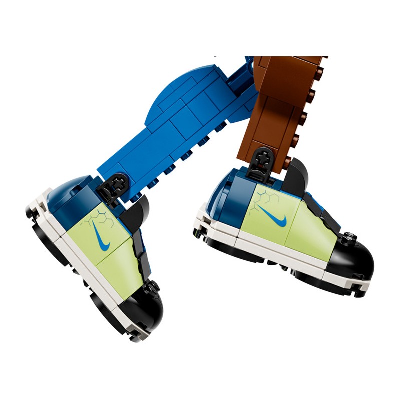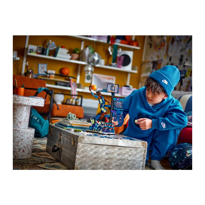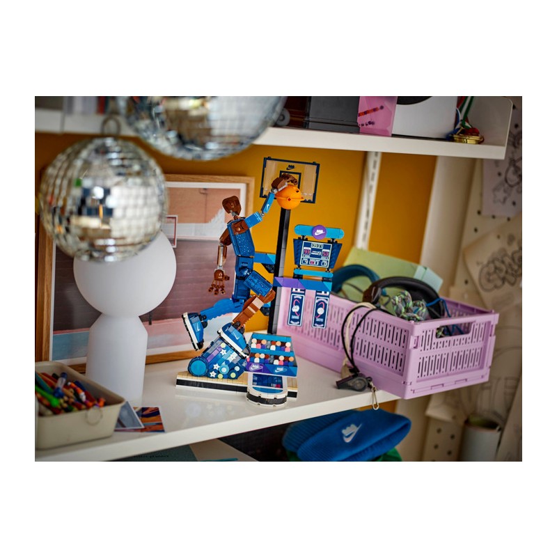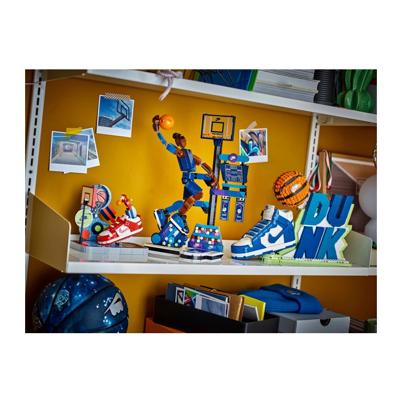 Дайте волю своему внутреннему чемпиону, собирая эту популярную модель и открыв для себя все детали, которые приведут толпу в восторг. Создайте фигурку баскетбольной звезды с подвижными руками и головой и оживите момент её броска сверху, добавив кольцо, табло, чемпионский баннер и зрителей. После того, как вы создадите своего баскетболиста, насладитесь его индивидуальностью: выберите причёску и украсьте его футболку Nike и кроссовки разными номерами и отделкой.