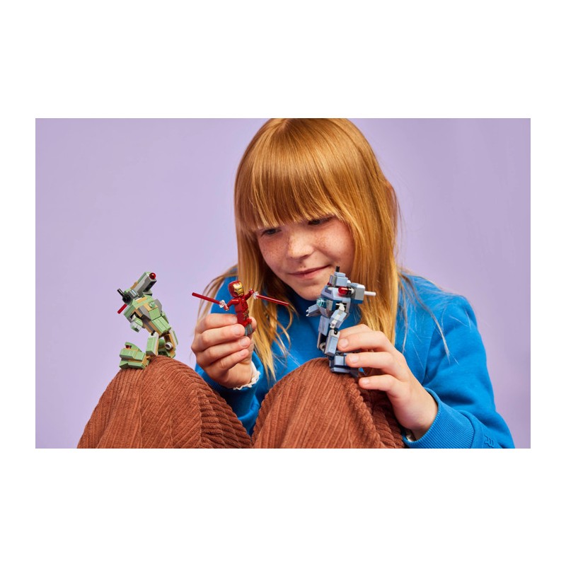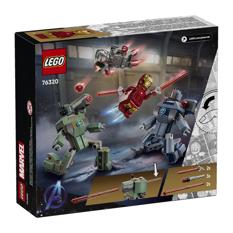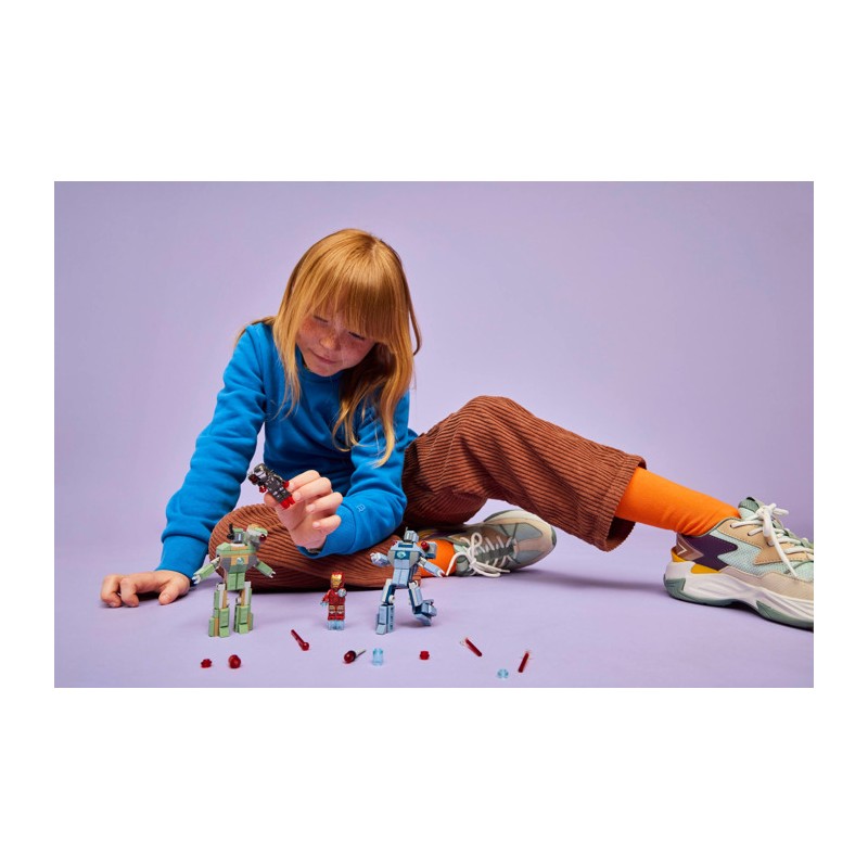Эта сборная игрушка воссоздает эпическую сцену битвы из фильма «Железный человек 2» от Marvel Studios. В комплект входят минифигурки Железного человека и Воителя, а также два сборных дрона-молота. Дроны-молоты полностью шарнирные, поэтому дети могут устанавливать их в разные положения для реалистичной динамичной игры. Зеленый дрон-молот оснащен пружинным шутером на плече. Синий дрон-молот оснащен толкающими шутерами на каждом плече. Воитель оснащен красными бластерами на руках и ногах и шипометом на плече. Железный человек оснащен синими бластерами на руках и ногах и может держать лазерные лучи. Для большего цифрового веселья строители могут увеличивать масштаб, вращать модели в 3D и отслеживать свой прогресс с помощью интуитивно понятного приложения LEGO Builder. Содержит 204 детали.