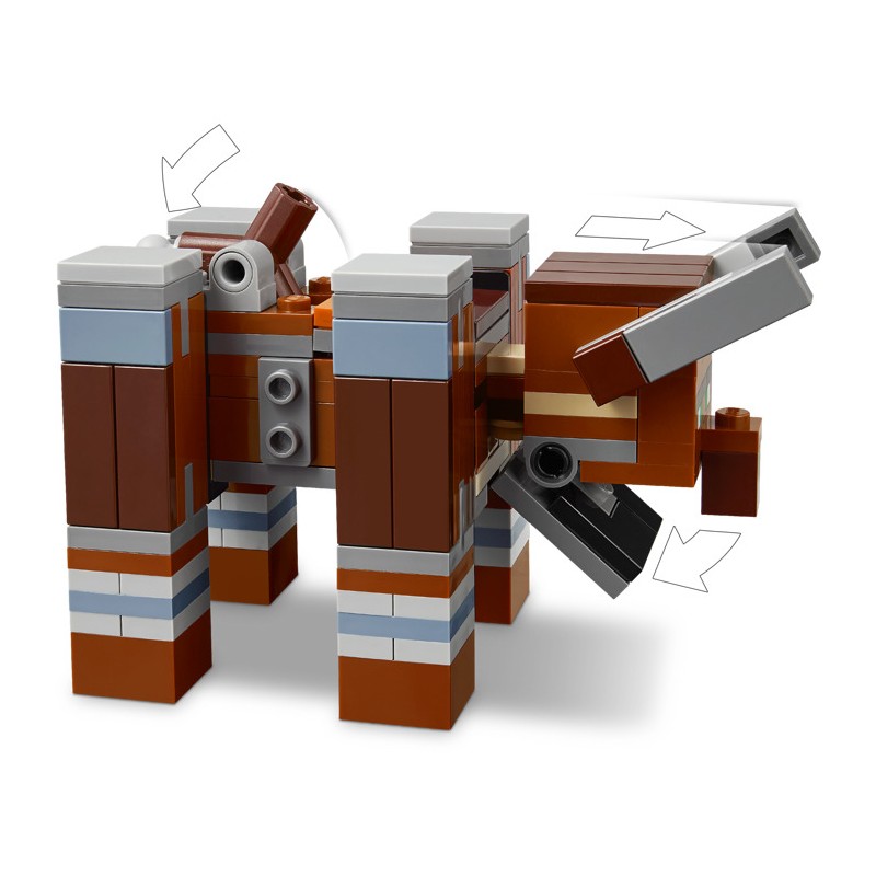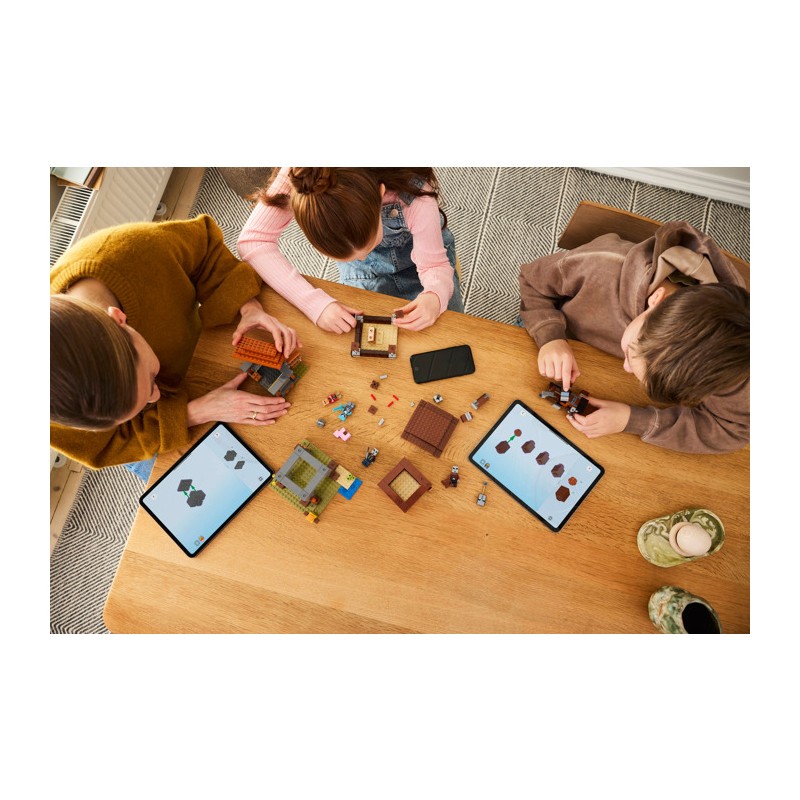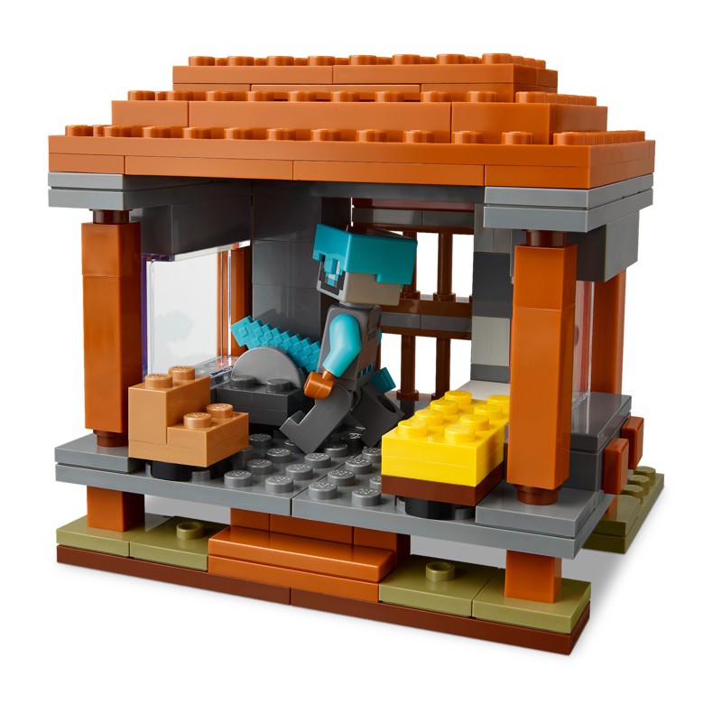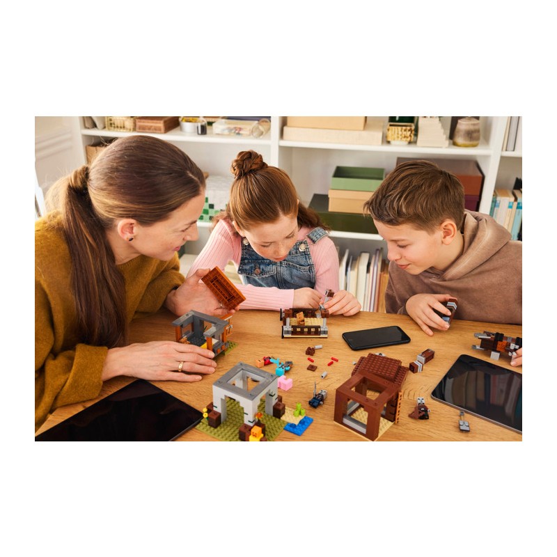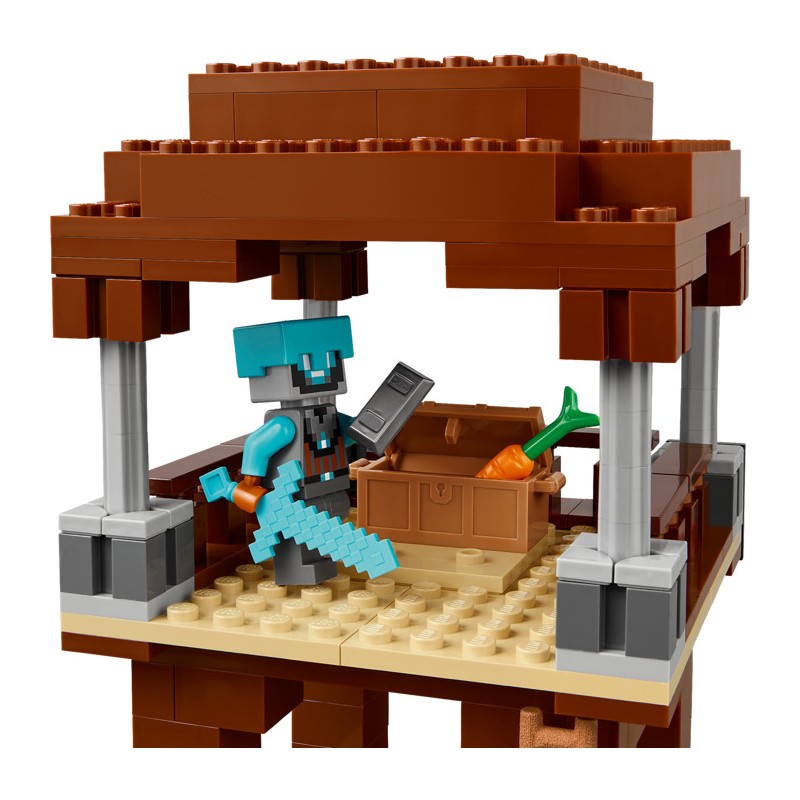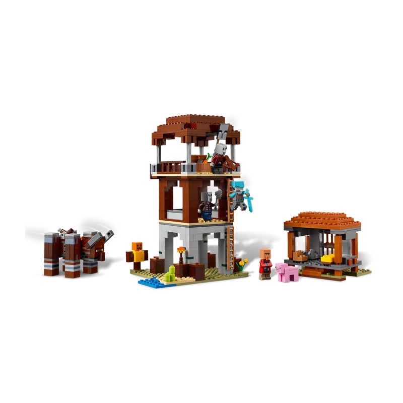 В набор входят 4 минифигурки LEGO Minecraft: Космический страж, Капитан рейда, житель деревни каменщик и Защитник. Сборная фигурка опустошителя имеет функцию рычага, которая позволяет детям делать движения, вызывающие щелчки челюстями и удары головой. Сторожевая башня включает лестницы для обеспечения доступа между тремя этажами, баннеры с изображением лиц грабителей и сундук с драгоценной добычей. В доме каменщика есть открывающаяся дверь и меблированный интерьер с кроватью и каменотесом. Также есть фигурка свиньи LEGO Minecraft и аксессуары, включая учебный манекен, факел, морковь, железный слиток, алмазный шлем, алмазный меч, арбалет и железный топор. Приложение LEGO Builder дает детям дополнительное удовольствие от использования своего устройства для увеличения и вращения моделей в 3D. Содержит 665 деталей.