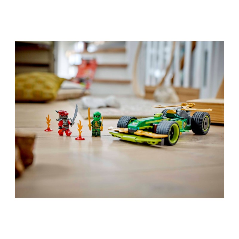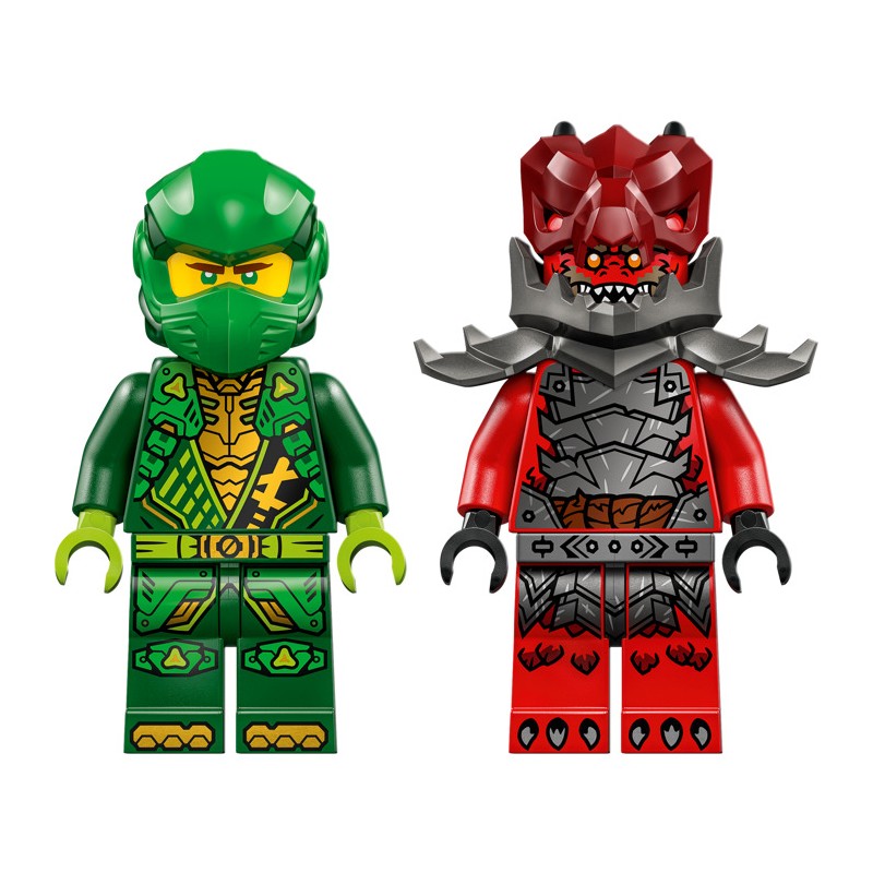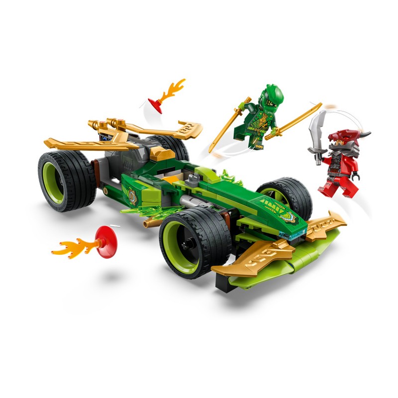 В набор для ролевых игр входят 2 минифигурки NINJAGO: Ллойд с 2 золотыми мечами-катанами и злодейский Воин Дракона с мечом-аксессуаром для детей, чтобы разыгрывать захватывающие битвы. В набор также входят 2 элемента освещения для создания небольшой полосы препятствий для гоночной машины.