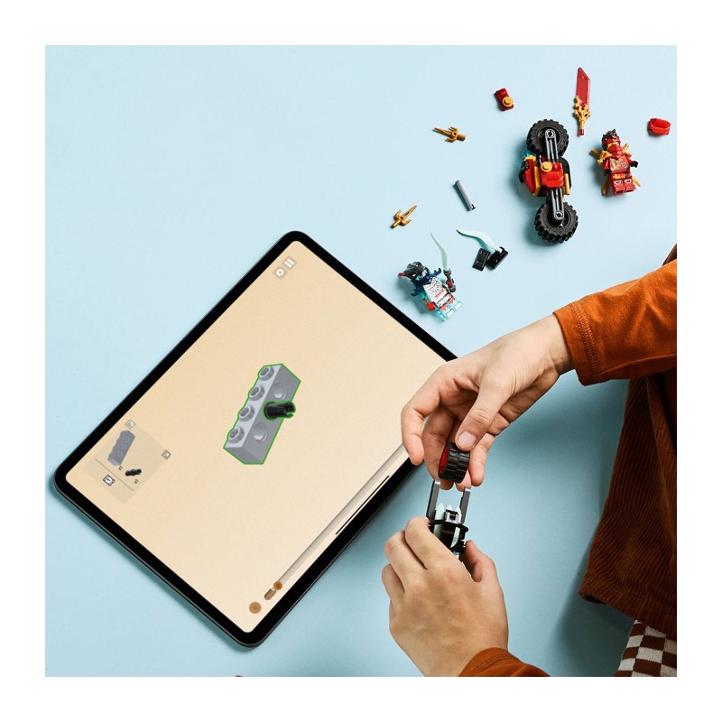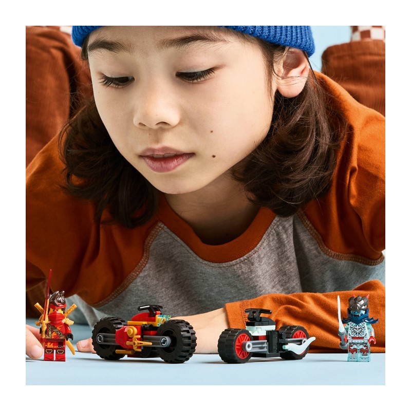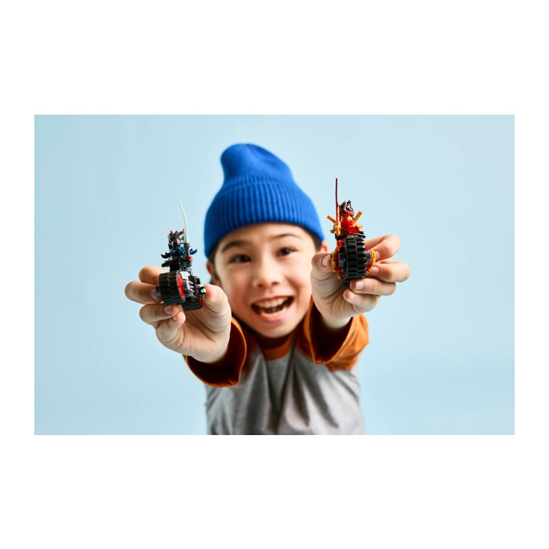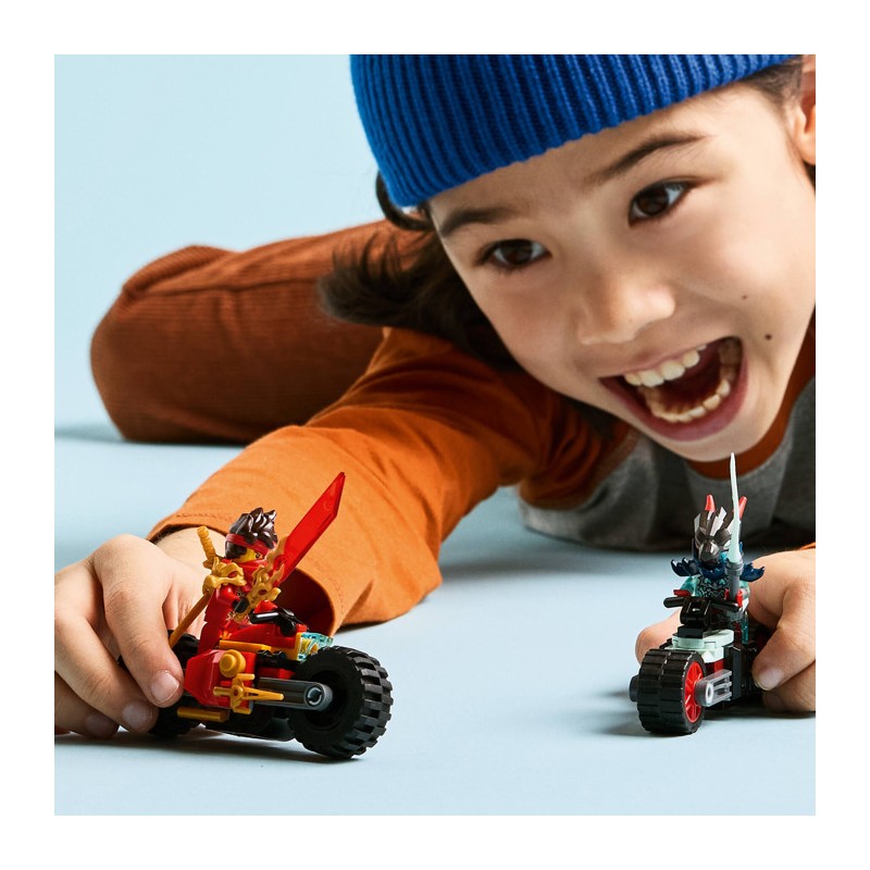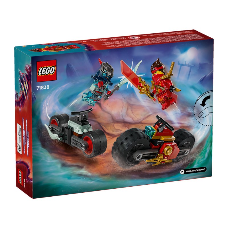 Мальчики и девочки в возрасте от шести лет и старше могут воссоздать сцены из третьего сезона сериала NINJAGO Rise of the Dragons с помощью набора «Мотогонщик Кая» (71838). Этот полный приключений игровой набор для погони включает в себя 2 мотоцикла ниндзя с движущимися колесами: гоночный мотоцикл Кая, украшенный двумя кинжалами, и демонический мотоцикл злого разведчика Спектрального Драгуна.