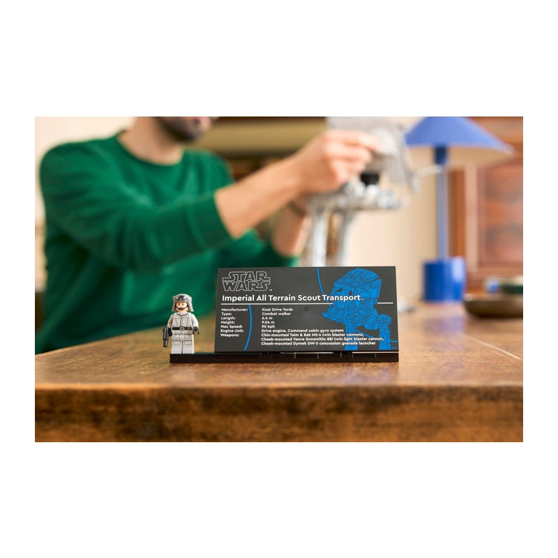 Эта коллекционная сборная модель транспортного средства поставляется с информационной табличкой и уникальной минифигуркой водителя AT-ST LEGO Star Wars (с имперским гербом, напечатанным на руках), что завершает эффектный центральный элемент.