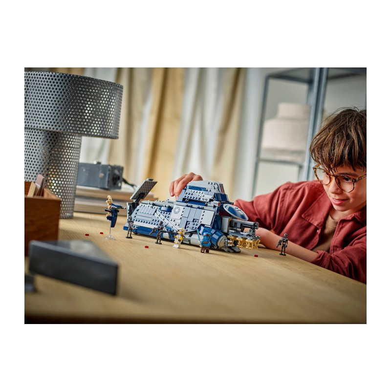 Оживите в памяти динамичные сцены битвы при Фелуции из «Звёздных войн : Войны клонов™» с этим набором для сборки сепаратистского транспортного средства (75435) для мальчиков, девочек и всех поклонников от 9 лет. Этот сборный автомобиль из вселенной «Звёздных войн ™» обладает множеством реалистичных деталей, вдохновляющих на творческие игры, включая стойку для размещения дроидов, которая выдвигается через передний люк при повороте ручки. MTT также имеет откидные боковые панели для лёгкого доступа к детально проработанному интерьеру, кабину пилота, спидер STAP, спрятанный в заднем отсеке, два шипомёта и скрытые колёса для плавного перемещения по ровной поверхности. Используйте этот потрясающий автомобиль в качестве фэнтезийного декора между игровыми приключениями.