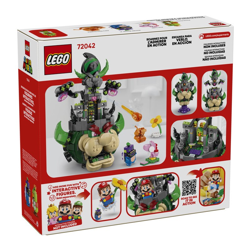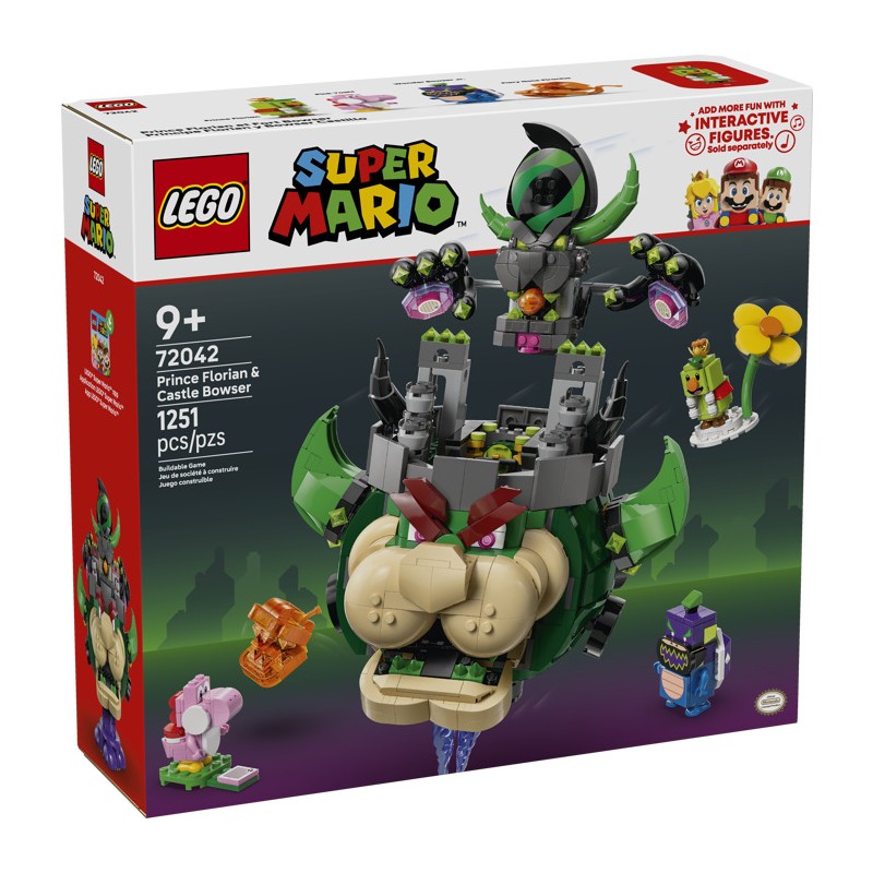 Позвольте детям воссоздать битвы Super Mario Bros™ Wonder и освободить принца Флориана из замка Боузера с этим увлекательным набором LEGO® Super Mario™ (72042). Этот детально проработанный набор «Замок Боузера» станет отличным подарком для мальчиков, девочек и всех геймеров от 9 лет. Он включает в себя фигурки Розового Йоши, Пираньи Огненной Ноты, принца Флориана и младшего Чудо-Бозера для ролевых игр и демонстрации. Поднимите замок Боузер с подставки и поставьте его на место, чтобы увидеть его внутреннее пространство, включая камеру для заключения принца Флориана. Поднимите весь замок с подставки, чтобы он «полетал» вокруг, или просто снимите верхнюю часть, чтобы он «полетал» и выстрелил огненным шаром изо рта. Добавьте к этому конструктору фигурку LEGO® Mario™, LEGO® Luigi™ или LEGO® Peach™ (из наборов 71439, 71440, 71441 или 72043 — продаются отдельно) для цифровой интерактивной игры, включая битву с финальным боссом. Обратите внимание на другие захватывающие наборы LEGO Super Mario (продаются отдельно). В наборе 1251 деталь.