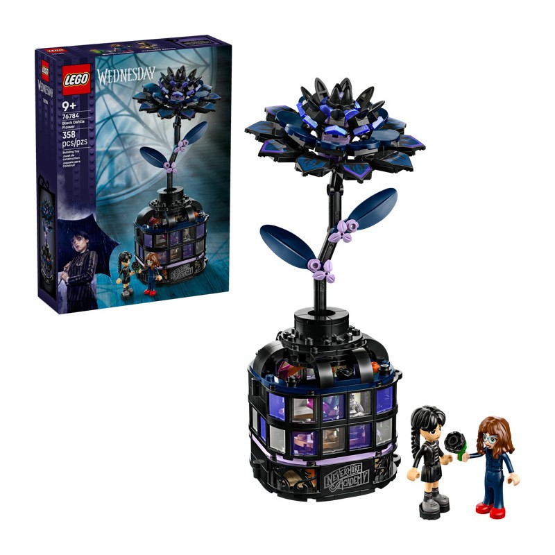 Этот набор LEGO® Wednesday «Цветок чёрного георгина» (76784) станет прекрасным украшением для любителей ботаники и дизайна в возрасте от 9 лет. Этот набор украшен чёрным георгином с листьями и светло-фиолетовыми соцветиями, а также вазой, напоминающей мини-оранжерею. После сборки дети снимают георгин, чтобы открыть вазу и увидеть внутри классную комнату со съёмными партами, табуретом и другими аксессуарами для ролевых игр. В набор также входят мини-куклы Уэнсдей Аддамс и профессора Мэрилин Торнхилл для ролевых игр.